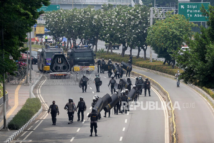 Sejumlah petugas kepolisian berjaga di sekitar kawasan gedung DPR, Senayan, Jakarta, Kamis (8/10). Pengamanan di kawasan senayan tersebut diperketat terkait aksi demo yang akan di gelar oleh sejumlah buruh dan mahasiswa dalam menolak UU Cipta kerja. Prayogi/Republika.       Foto: Prayogi/Republika