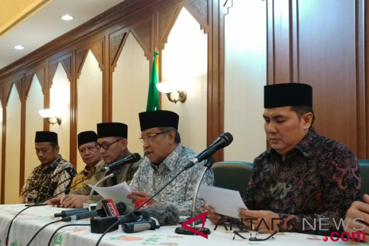 Ketua Umum Pengurus Besar Nahdlatul Ulama Said Aqil Siroj (dua dari kanan) dalam konferensi persnya di Jakarta, Senin (3/12/2108). (Anom Prihantoro)