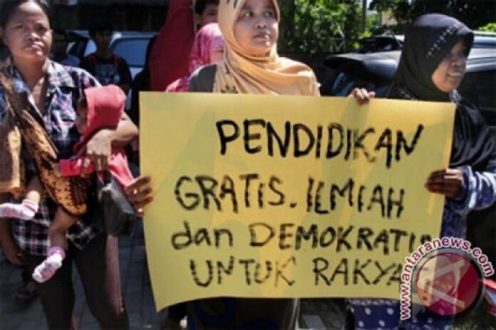 Protes Pungutan Pendidikan Sejumlah ibu rumah tangga berunjuk rasa di depan Kantor Diknas Kota Serang, Banten, Senin (14/7). Mereka memprotes masih adanya pungutan biaya pendidikan di sekolah negeri sebab selain memberatkan juga tumpang tindih dengan dana BOS yang telah diberikan kepada sekolah melalui APBN. (ANTARA FOTO/Asep Fathulrahman)
