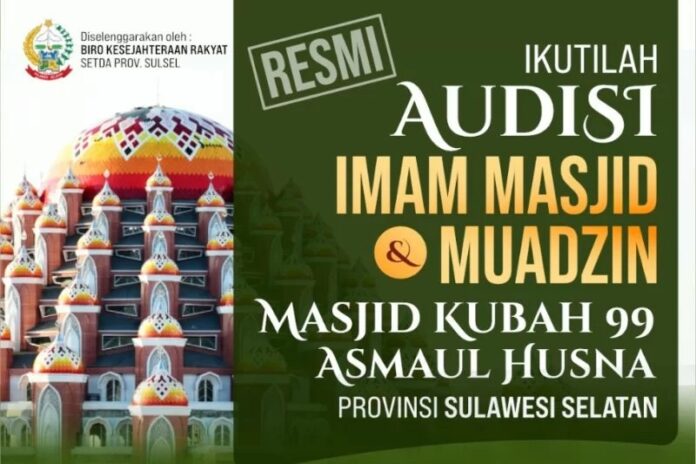Makassar, JIC – Pemerintah Provinsi Sulawesi Selatan menggelar Audisi Imam Masjid dan Muadzin untuk Masjid Kubah 99 Asmaul Husna, Makassar, yang pendaftarannya dibuka secara daring 18 hingga 23 Januari 2022.