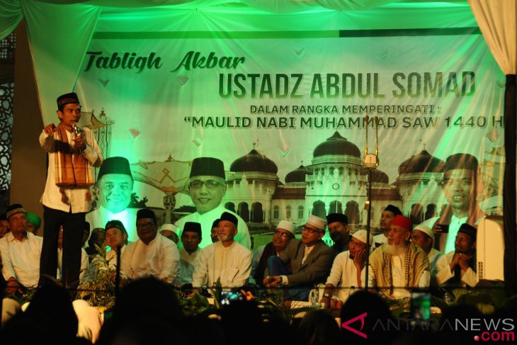 USTADZ ABDUL SOMAD TAUSYIAH MAULID DI ACEH Ustadz Abdul Somad memberikan tausyiah saat zikir akbar di Masjid Raya Baiturrahman, Banda Aceh, Minggu (25/11/2018) malam.                                                                                                 ANTARA FOTO/Ampelsa/hp.