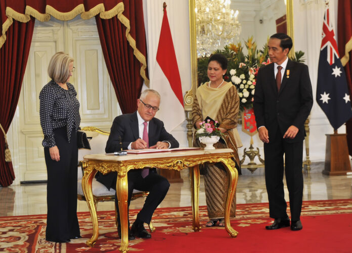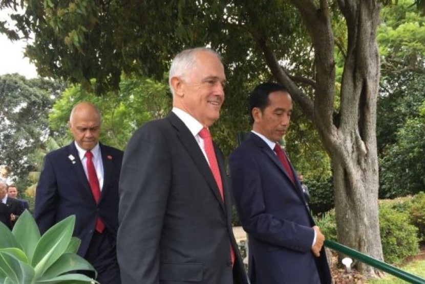 PM Australia Malcolm Turnbull (tengah) dan Presiden Indonesia Joko Widodo (kanan) saat berada di Australia, Ahad (26/2).