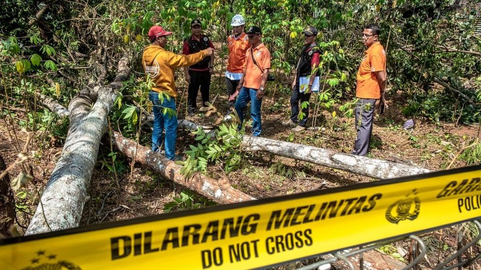 Image captionPersonel Tim Labfor Mabes Polri Cabang Semarang melakukan olah tempat kejadian perkara (TKP) peristiwa ledakan yang diduga akibat loncatan arus jaringan sutet 500 kV interkoneksi Jawa-Bali yang melintang di Gunungpati, Semarang, Jawa Tengah, Selasa (06/04).