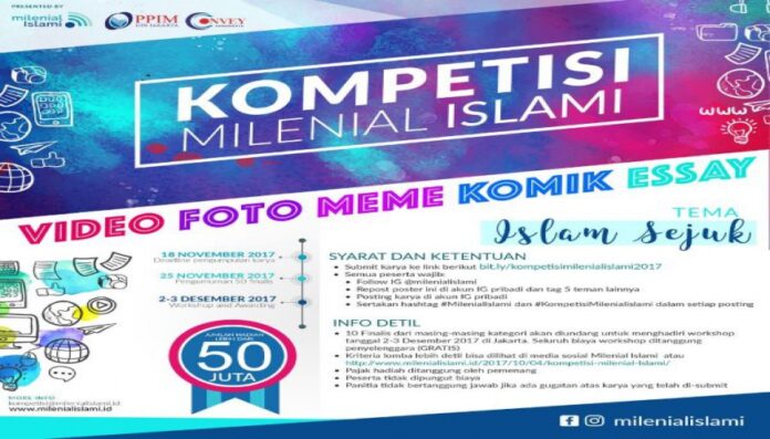 JIC, Jakarta — Ada kabar gembira bagi muslim generasi milenial. Pasalnya, pada bulan November dan Desember 2017, akan ada Kompetisi Milenial Islami. Perhelatan yang bakal terselenggara berkat kerjasama Milenial Islami dengan PPIM UIN Jakarta dan Convey Indonesia ini menghadirkan berbagai macam lomba seperti Lomba Meme, Video, Foto, Komik dan Essay.