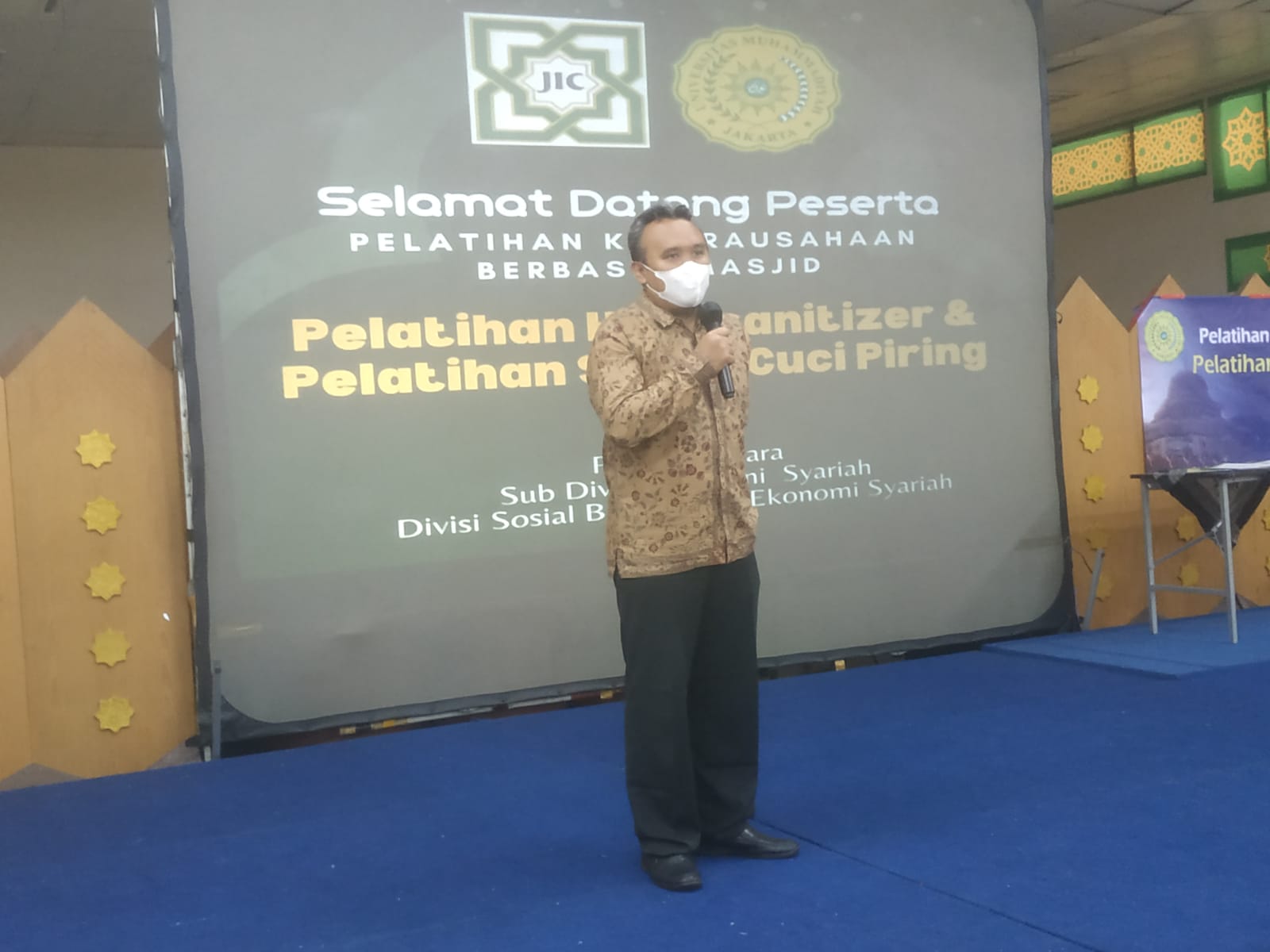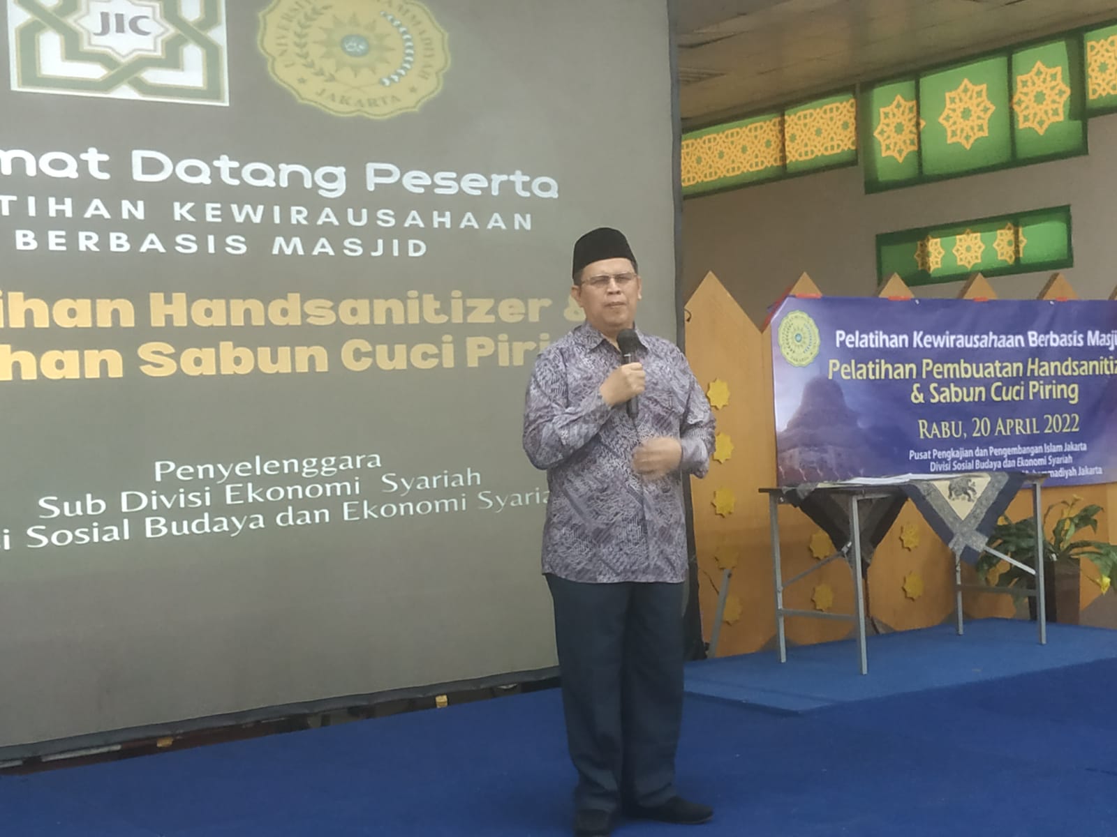 JIC- Subdivisi Ekonomi Syariah bekerjasama dengan Jurusan Teknik Kimia Universitas Muhammadiyah Jakarta, menyelenggarakan Program Pelatihan Kewirausahaan Berbasis Masjid Pembuatan Handsanitizer & Sabun Cuci Piring, di Jakarta Islamic Centre, Kamis (20/4/2022).