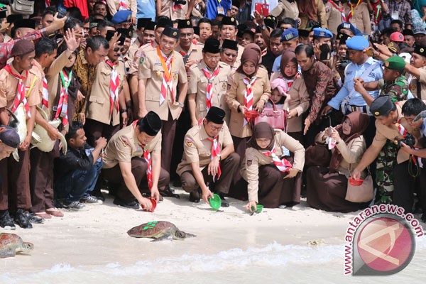 “Saya bangga ketika mendengar adik-adik pramuka madrasah melakukan pelepasan tukik (anak penyu) yang menjadi catatan Rekor Muri, karena ini bagian dari menjaga kelestarian lingkuangan,” pekiknya disambut tepuk tangan hadirin.