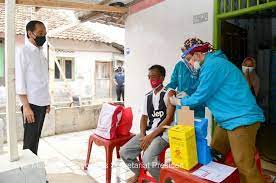 Presiden Joko Widodo meninjau langsung program vaksinasi COVID-19 untuk masyarakat secara pintu ke pintu (door to door). Kegiatan vaksinasi ini dilaksanakan kepada 500 warga di Kampung Pengampaan, Kecamatan Harjamukti, Kota Cirebon, pada Selasa, (31/8/2021). ANTARA/HO-Muchlis Jr – Biro Pers Sekretariat Presiden/pri.