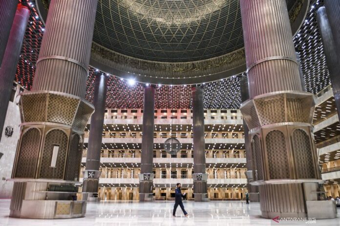Seorang petugas berjalan di ruang utama usai peresmian renovasi Masjid Istiqlal, Jakarta, Kamis (7/1/2021). Renovasi masjid Istiqlal yang menelan biaya sebesar Rp511 miliar dari APBN merupakan renovasi pertama sejak 42 tahun. ANTARA FOTO/M Risyal Hidayat/hp/pri.