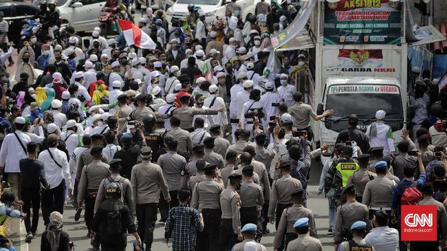 Aparat gabungan membubarkan masa pengunjuk rasa 1812 di sekitar Monas, Jakarta, Jumat, 18 Desember 2020. (CNNIndonesia/Adhi Wicaksono)