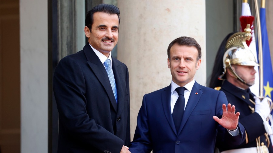 Sheikh Tamim bin Hamad Al Thani bertemu dengan Presiden Prancis Emmanuel Macron di kediaman resmi presiden Republik Perancis, Istana Elysee, pada kunjungan kenegaraan pertamanya ke negara Eropa tersebut sejak naik tahta pada tahun 2013.