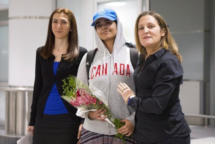 JIC, TORONTO — Rahaf Mohammed al-Qunun (18 tahun), perempuan Saudi yang melarikan diri dari keluarganya, telah tiba di Toronto, Kanada, pada Sabtu (12/1), setelah mendapatkan suaka dari negara itu. Ia disambut oleh Menteri Luar Negeri Kanada Chrystia Freeland yang menyebutnya sebagai seorang warga Kanada yang pemberani.