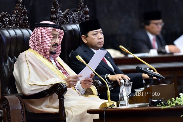 JIC, JAKARTA — Raja Arab Saudi, Salman bin Abdul Aziz al-Saud menyampaikan pidatonya di depan tamu undangan yang memenuhi Ruang Paripurna I. Meski tidak lebih dari 10 menit, tapi ada poin penting yang disampaikan raja ketujuh dalam Dinasti Al-Suud (Al-Saud) III.
