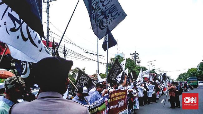 JIC, Jakarta, — Ratusan orang membawa bendera bertuliskan kalimat tauhid dan menggelar aksi di depan Markas Kepolisian Daerah Jawa Timur (Mapolda Jatim).