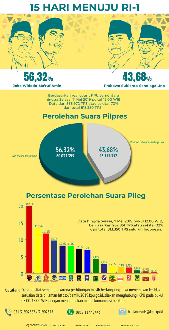 News Update REAL COUNT KPU KINI 70% May 7, 2019 0 270 FacebookXPinterestWhatsApp JIC, JAKARTA– Perhitungan perolehan suara Pemilu 2019 oleh KPU hingga Selasa, 7 Mei 2019, pukul 12.00 WIB.