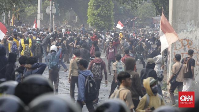 Berdasarkan pantauan CNNIndonesia.com di lokasi kejadian, massa melempari batu ke arah gedung DPR. Mereka juga menyanyikan lagu nasional dan yel-yel.