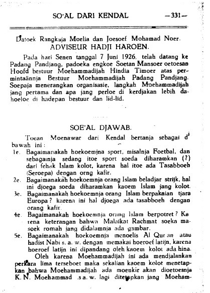 Pertanyaan itu diajukan oleh pelanggan Suara Muhammadiyah dengan nomor pelanggan 183 yang bernama M. Moenawar bin Halil dan berdomisili di Kendal. Pertanyaan itu dijawab oleh Pemimpin Redaksi Suara Muhammadiyah (Abdul Azis). Pertanyaan dan jawaban ini dimuat di dalam Suara Muhammadiyah edisi Muharram tahun 1345/Juli 1926 halaman 331-332.