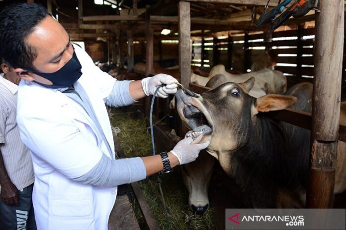 Arsip Foto – Petugas Dinas Pangan Pertanian Kelautan dan Perikanan memeriksa kesehatan gigi dan mulut ternak sapi di tempat resmi penjualan hewan qurban, Desa Batoh, Banda Aceh, Jumat (24/7/2020). (ANTARA/Ampelsa)