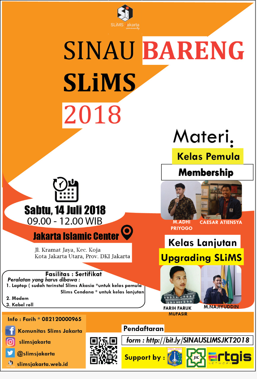 Kegiatan ini tidak dipungut biaya (gratis) dengan fasilitas mendapatkan sertifikat. Peserta diharuskan membawa Laptop yang sudah ter-install Slims Akasia (untuk kelas Pemula) dan Slims Cendana (untuk kelas lanjutan), modem, kabel roll. Untuk Pendaftaran silahkan mengakses http://bit.ly/SINAUSLIMSJKT2018