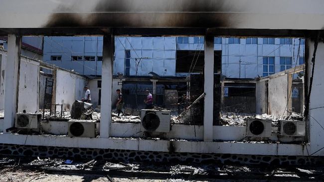 Karyawan memeriksa kondisi bangunan Kantor KPU Papua yang hangus terbakar di Jayapura, Papua, Sabtu (31/8/2019). (ANTARA FOTO/Zabur Karuru)