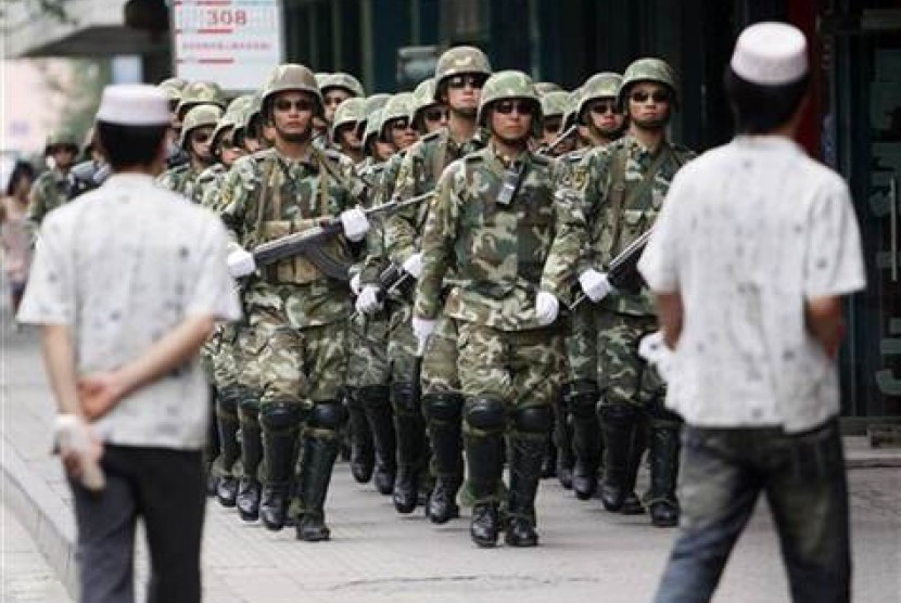 Dua orang Muslim Uighur di Xinjiang melintas di depan parade militer Cina.          Foto: AP