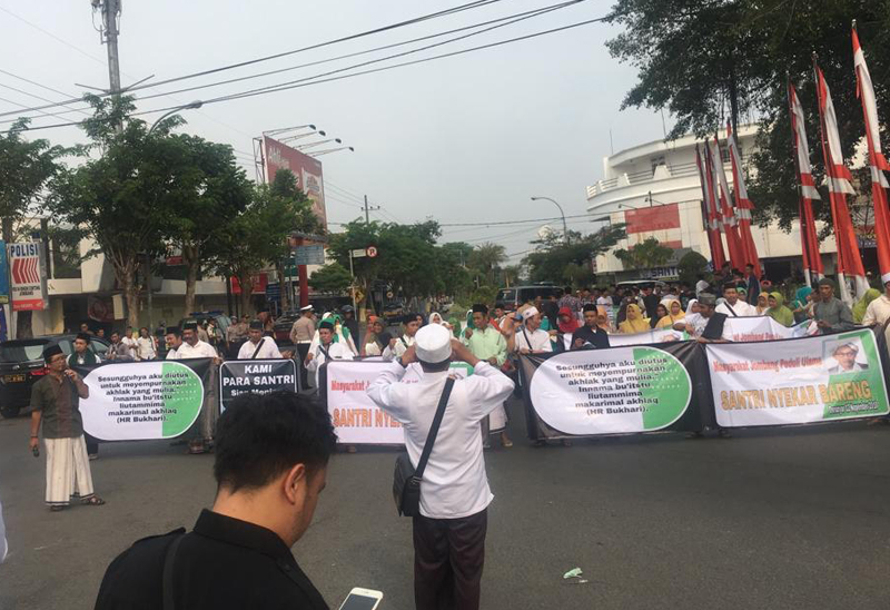 Ratusan umat Islam yang tergabung dalam Masyarakat Jombang Peduli Ulama (MJPU) melakukan long march dan nyekar bersama ke makam tokoh Nahdlatul Ulama (NU) KH Bisri Syansuri di Pesantren Mamba’ul Ma’arif Denanyar, Jombang, Jawa Timur.