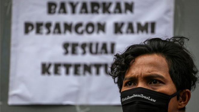 Image captionSeorang buruh menggelar aksi unjuk rasa di depan pabriknya di Benda, Kota Tangerang, Banten, 1 Mei lalu.