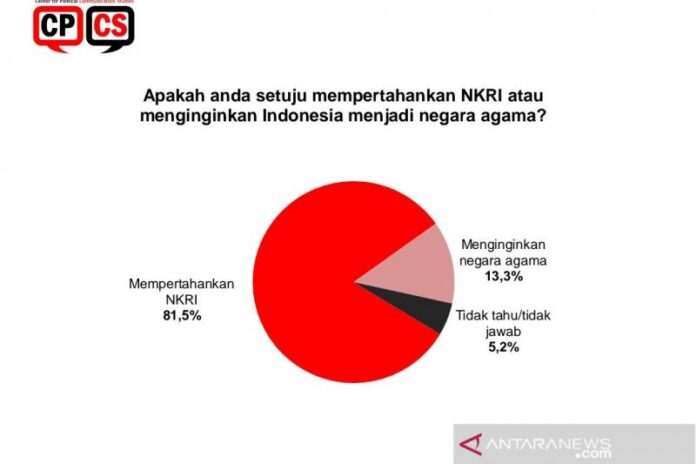 Hanya sebagian kecil yang menginginkan Indonesia menjadi negara agama, sebesar 13,3 persen. Sisanya 5,2 persen menyatakan tidak tahu/tidak jawab.