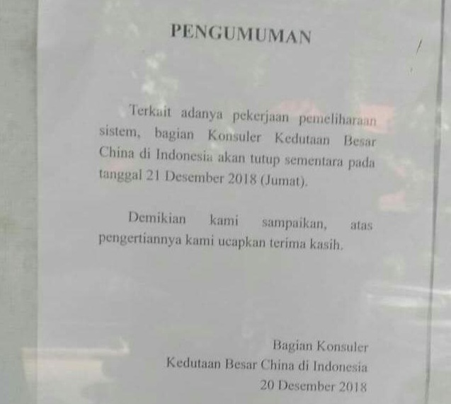 “Terkait adanya pekerjaan pemeliharaan sistem, bagian Konsuler Kedutaan Besar China di Indonesia akan tutup sementara pada tanggal 21 Desember 2018 (Jumat),” demikian tertulis pengumuman yang diterima oleh Panjimas pada Jumat (21/12) pagi ini.