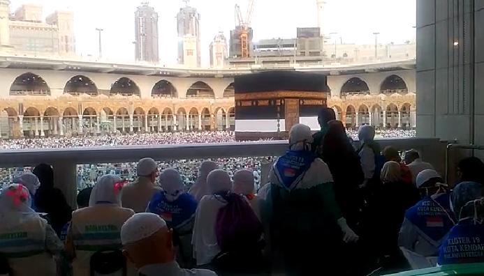 Jemaah haji Indonesia sedang bermunajat di Masjidl Haram sambil menghadap ke arah Baitullah