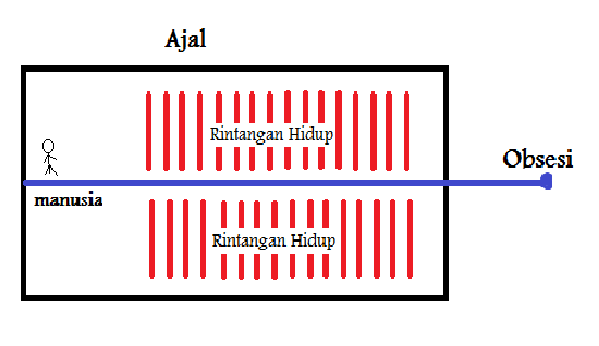 “Ini manusia. Dan ini ajalnya, mengelilinginya. Dan garis yang menembus bangun ini adalah obsesinya. Sementara garis kecil-kecil ini adalah rintangan hidup. Jika dia berhasil mengatasi rintangan pertama, dia akan tersangkut rintangan kedua. Jika dia berhasil lolos rintangan kedua, dia tersangkut rintangan berikutnya.” (HR. Bukhari 6417).
