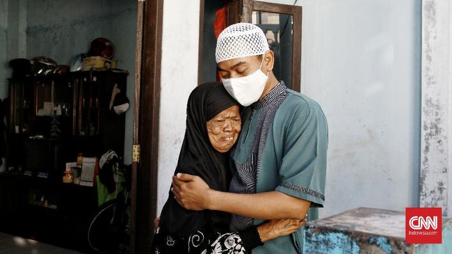 Suasana Idul Fitri tetap terasa antar warga Jalan Haji Hamsar, Cipulir, Jakarta Selatan dengan saling memaafkan antar anggota keluarga. Jakarta. Minggu (24/5/2020). (CNN Indonesia/Andry Novelino)