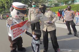 Polisi melakukan kampanye sosialisasi menggunakan masker dan cuci tangan saat hari bebas kendaraan bermotor di kawasan Sudirman, Jakarta, Minggu (8/11/2020). ANTARA FOTO/ Reno Esnir/foc.