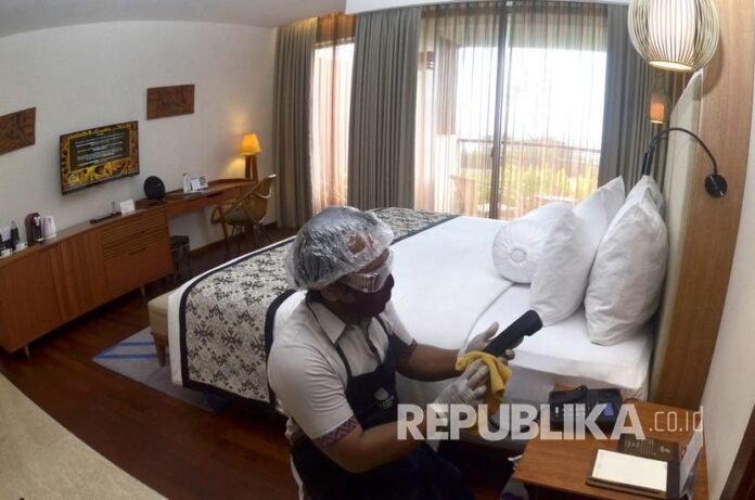 Pekerja hotel menggunakan alat pelindung diri saat menyiapkan kamar di Hotel Inaya Putri Bali, Nusa Dua, Badung, Bali, Jumat (5/6/2020). Menjelang penerapan tatanan hidup normal baru (new normal), hotel tersebut menerapkan protokol kesehatan seperti dengan penggunaan alat pelindung diri, melakukan penyemprotan cairan disinfektan secara rutin, memeriksa suhu tubuh tamu hotel, memberi jarak antar kursi di restoran serta menyiapkan menu makanan secara digital sebagai upaya pencegahan penyebaran Covid-19.               Foto: Antara/Fikri Yusuf