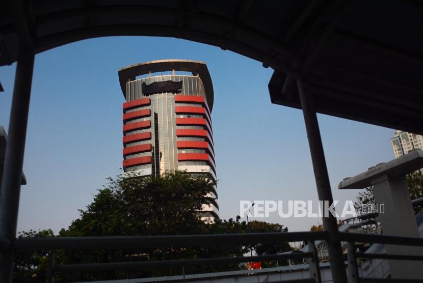 Kain hitam menutupi lambang kpk sebagai bentuk aksi terhadap revisi UU KPK di Gedung Merah Putih, Jakarta, Ahad (8/9/2019).    Foto: Republika