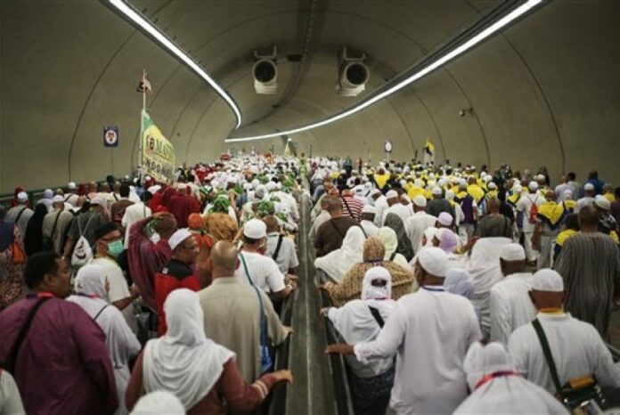 Jamaah haji dari berbagai negara melintasi terowongan di Mina, menuju lokasi melontar jumrah.