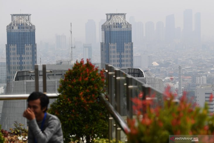 Warga beraktivitas dengan latar belakang suasana gedung bertingkat yang diselimuti asap polusi di Jakarta, Senin (29/7/2019). Data aplikasi AirVisual yang merupakan situs penyedia peta polusi daring harian kota-kota besar di dunia, menempatkan Jakarta pada urutan pertama kota berpolusi sedunia pada Senin (29/7) ANTARA FOTO/Wahyu Putro A/ama. (ANTARA FOTO/WAHYU PUTRO A)