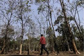 Seorang warga melintasi pohon-pohon yang mulai kering di Buperta Cibubur, Jakarta, Selasa (22/10/2019). Badan Meteorologi, Klimatologi, dan Geofisika (BMKG) mencatat suhu panas udara maksimum 37 derajat celcius terjadi di wilayah Jawa berasal dari gerak semu matahari di selatan khatulistiwa. ANTARA FOTO/Asprilla Dwi Adha/hp. (ANTARA FOTO/ASPRILLA DWI ADHA)