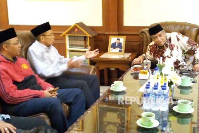 Tuan Guru Bajang (TGB) Zainul Majdi bersama Gubernur Pilgub NTB terpilih Zulkieflimansyah bersilaturahmi dengan Ketua Umum PBNU Pusat KH Said Aqil Siroj yang didampingi Sekjen PBNU KH Helmi Faisal dan Ketua PBNU KH Marshudi Suhud serta KH Robikin Emhas di Kantor PBNU Pusat, Jalan Kramat Raya, Senen, Jakarta Pusat, Selasa (10/7).