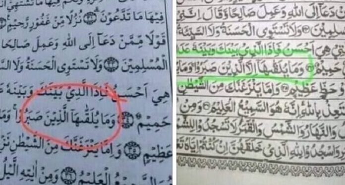 JIC, JAKARTA–Foto lembaran halaman Alquran disertai keterangan yang menyebutkan adanya kesalahan cetak berupa pengurangan kata ‘illa’ pada ayat 35 Surah Fushshilat viral di media sosial. Dalam keterangan disebutkan bahwa lembaran itu merupakan cetakan Annur.