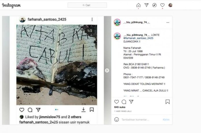 Perempuan itu mengaku namanya dicatut oleh pemilik akun @farhanah_s*n*oso_245. “Atas nama akun sudah diperiksa, tapi namanya dipakai orang,” kata Aziz.