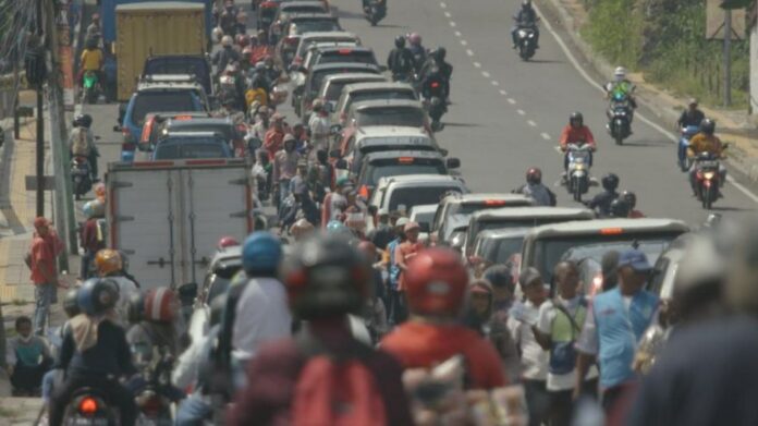 Image captionArus lalu lintas menuju kawasan Puncak, Kabupaten Bogor, Jawa Barat, pada Sabtu (20/06).