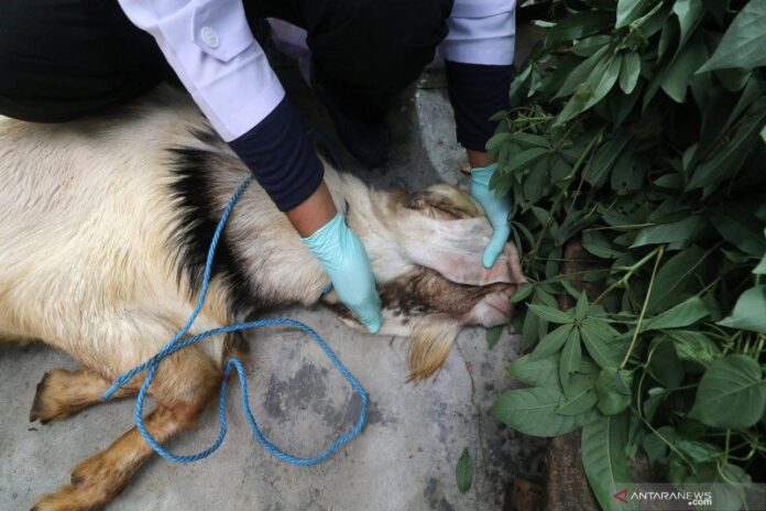 Dokter hewan Dinas Ketahanan Pangan dan Pertanian mempraktekkan menyembelih dengan cara menenangkan dan menutup mata kambing atau biasa disebut dengan metode hipnotis kepada pedagang hewan kurban musiman di Kelurahan Mojoroto, Kota Kediri, Jawa Timur, Rabu (22/7/2020). ANTARA FOTO/Prasetia Fauzani/pras