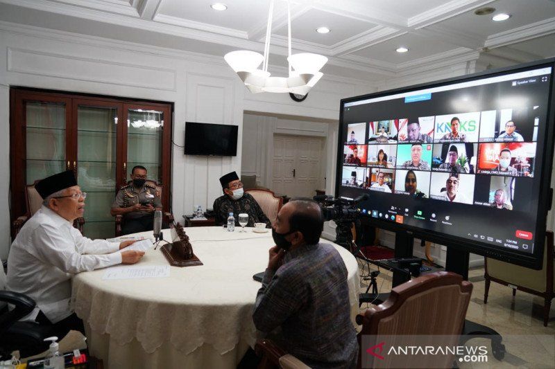 Wakil Presiden Ma’ruf Amin menerima sambungan telekonferensi dengan jajaran komisaris dan direksi PT Fintek Karya Nusantara/LinkAja di rumah dinas wapres Jakarta, Senin (10/8/2020). (Asdep KIP Setwapres)