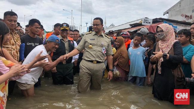 Gubernur DKI Anies Baswedan saat berkunjung ke salah satu titik banjir di Semanan, Kalideres pada Januari 2020. Foto: CNN Indonesia/ Tiara Sutari