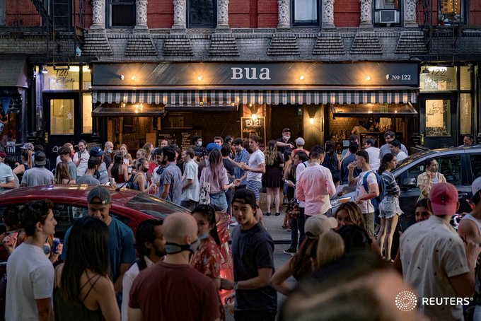 Sejumlah warga menikmati minuman di luar sebuah bar saat fase pembukaan kembali, di tengah penyebaran penyakit virus corona (COVID-19), di East Village, New York City, Amerika Serikat, Jumat (12/6/2020). (ANTARA/REUTERS/Jeenah Moon/TM/aa)