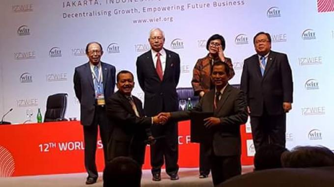 Penandatanganan MoU oleh Dirut JIEP Rahmadi Nugroho dengan Direktur Operasional PT IPC Saptono R. Irianto disaksikan Menkeu Sri Mulyani, Kepala Bappenas Bambang S. Brojonegoro, dan Perdana Menteri Malaysia Dato Sri Mohd Najib Tun Abdul Razak, dan Chairman of The WIEF Foundation Tun Musa Hitam.